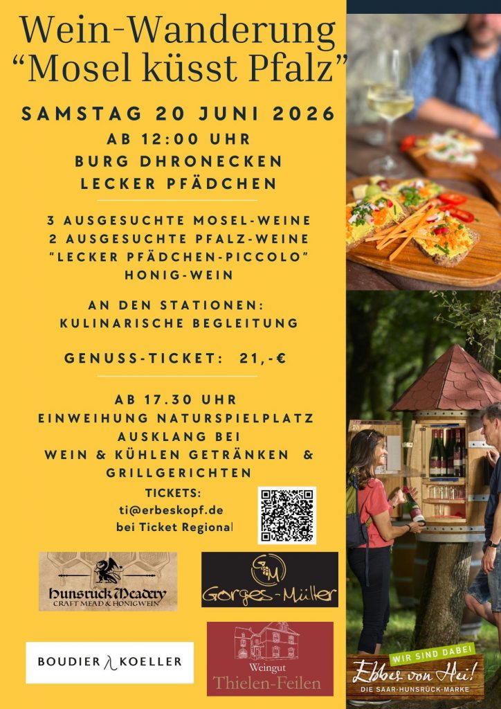 Thalfang: Das Lecker Pfädchen lädt am Samstag, 20. Juni gemeinsam mit den Mosel-Weingütern Gorges-Müller aus Burgen und Thielen-Feilen aus Minheim, sowie dem Pfälzer-Weingut Boudier-Koeller, aus der Verbandsgemeinde Kirchheimbolanden zu der beleibten Wein-Wanderung ein. Genießen Sie auf der Traumschleife Lecker Pfädchen 3 ausgesuchte Mosel-Weine, 2 Pfalz-Weine und einen Honig-Wein von Hunsrück-Meadery an den drei Genussstationen. Mehr braucht […]