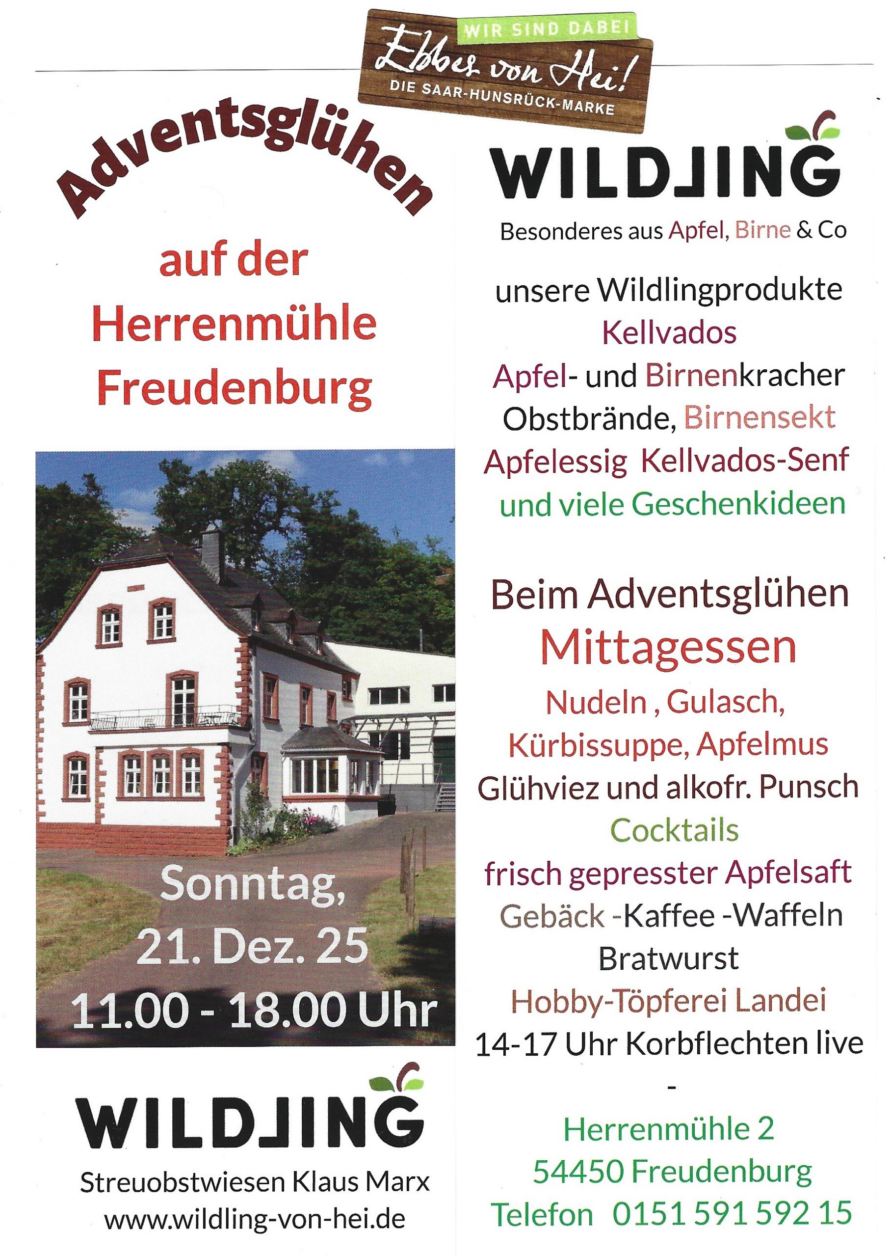 Adventsglühen auf der Herrenmühle + Zu Google Kalender hinzufügen + iCal / Outlook exportieren Datum 21 Dez. 2025 Abgelaufen! Uhrzeit 11:00 - 18:00 Standort Herrenmühle in Freudenburg Herrenmühle Veranstalter Wildling - Streuobstwiesen Klaus Marx Telefon 015159159215 Teile diese Veranstaltung